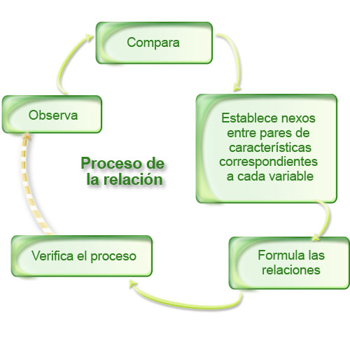 El proceso de relación consiste en establecer nexos entre dos características de un objeto o situación referidas a una misma variable. El proceso de relación es el paso siguiente a la comparación, ya que en la comparación se establecen semejanzas y diferencias de manera independiente y en la relación se llega un paso más allá en el procesamiento de la información, ya que se toman estas semejanzas y diferencias y se establecen conexiones entre ellas. Estas conexiones se expresan mediante la emisión de juicios, es decir, la afirmación o negación de algo.